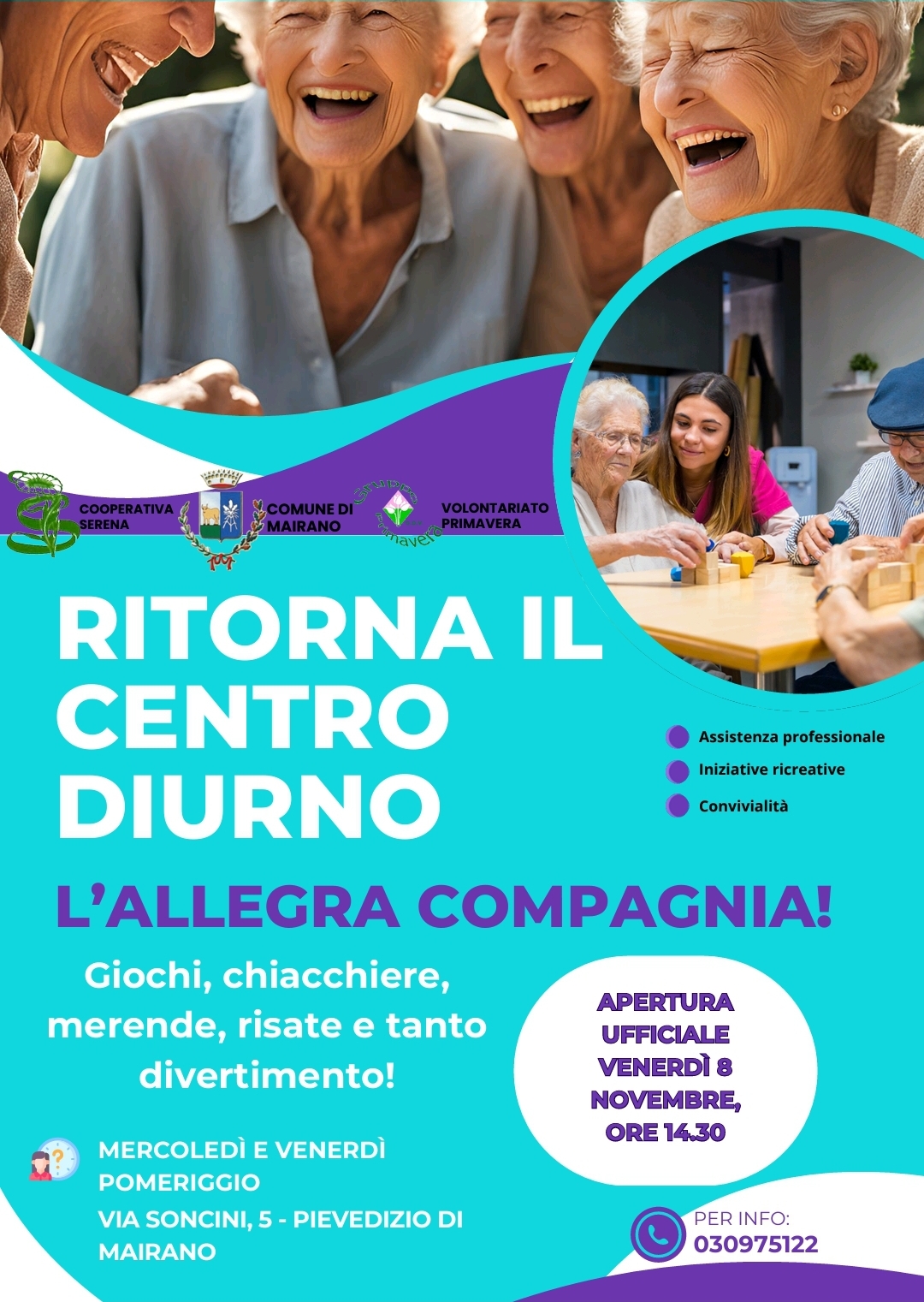 A partire dal 8 novembre 2024 riapre il Centro Diurno del Comune di Mairano L'allegra compagniain via Soncini n. 5 a Pievedizio nelle giornate di mercoledì e venerdì pomeriggio dalle 14.30 alle 17.00