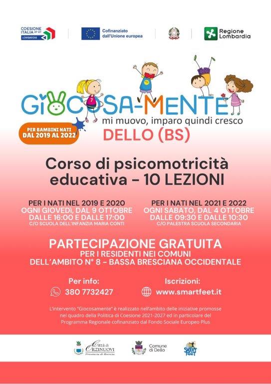 A Dello prende il via "Giocosamente", corso gratuito di psicomotricità educativa dedicato ai bambini nati tra il 2019 e il 2022 e riservato ai residenti nei comuni dell’Ambito 8 – Bassa Bresciana Occidentale. Il percorso prevede 10 lezioni: per i bambini nati nel 2019 e 2020 si terranno ogni giovedì dal 9 ottobre, dalle 16:00 alle 17:00 presso la Scuola dell’Infanzia Maria Conti; per i nati nel 2021 e 2022 il corso si svolgerà ogni sabato dal 4 ottobre, dalle 9:30 alle 10:30 presso la palestra della scuola secondaria. L’iniziativa è promossa nell’ambito della Politica di coesione 2021-2027 e cofinanziata dal Fondo Sociale Europeo Plus e Regione Lombardia. Per info è disponibile il numero 3807732427 e le iscrizioni online sul sito www.smartfeet.it.